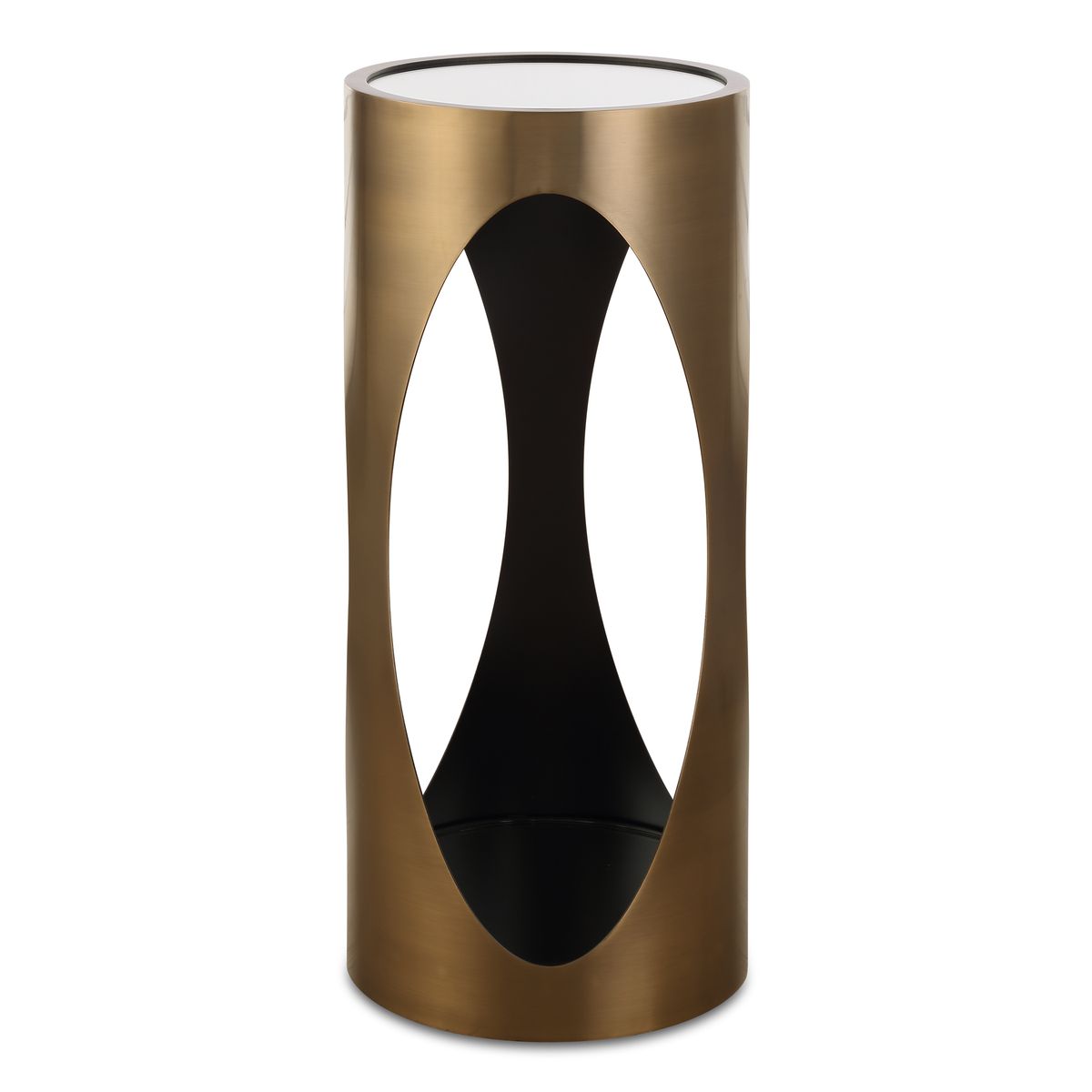 Achille's mirrored top rests on a sleek brushed brass cylindrical base creating a perfecting resting place for your favorite drink or accessory. An additional mirror in the base adds sculptural reflection.