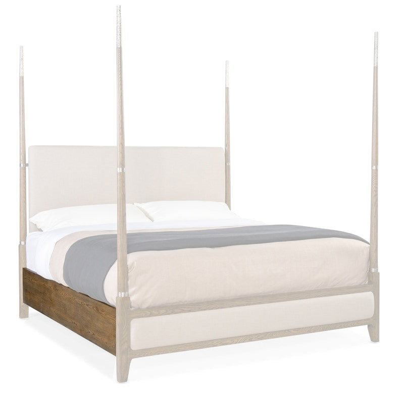 Inspired by downtown urban living, the stunning Chapman King Four Poster Bed has a headboard and footboard upholstered in Samantha Taupe and dramatic, slender posts accented by hand-hammered metal in a pewter finish. The footboard and bed are framed in White Oak Veneers in the warm brown Sorrel finish that reveals the beauty of the woodgrain. Includes headboard, footboard and rails. Headboard can be used alone. Hooker Furniture has launched the Chapman collection, a smaller-scaled, casual-contemporary whole home group. The 55-piece collection features a curated mix of materials that present an updated look inspired by downtown urban living. Over the past several years, Hooker Furniture has embarked on a transformation of our product line, adding more modern and updated styles to our portfolio to reach a younger demographic. Chapman aligns perfectly with this strategy, filling a style gap in our portfolio with a collection that offers contemporary styling with a relaxed, casual feel. Designed for consumers who may live in loft-style spaces or homes with open concept floorplans, pieces are smaller in scale, yet are thoughtfully designed to provide plenty of storage and exude a sophisticated style.
