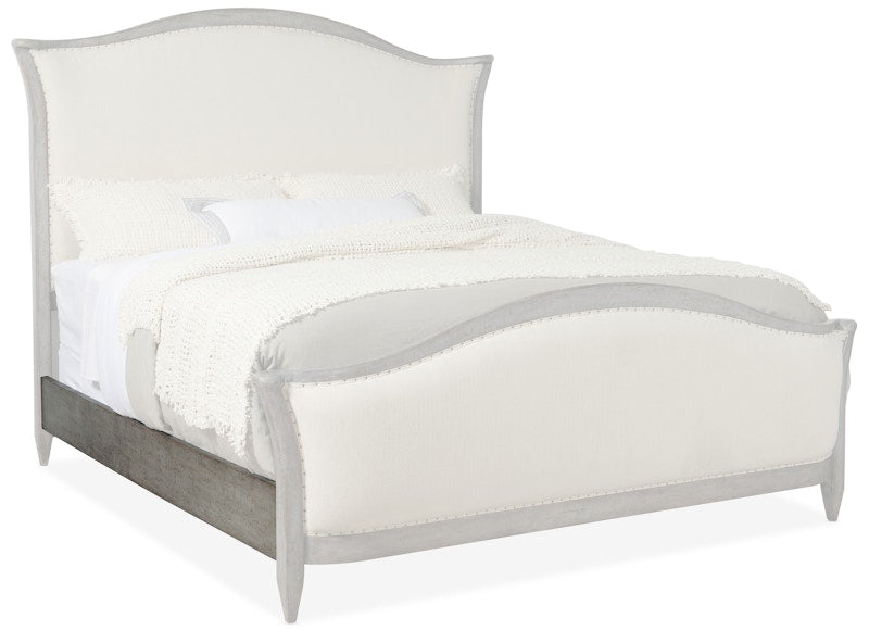 The sweeping, shaped headboard and footboard of the stunning Ciao Bella Queen Upholstered Bed will present a romantic centerpiece of your master suite or guest bedroom. The creamy Tuscan White upholstered headboard and footboard are framed in Poplar Solids finished in a hand-chiseled Speckled Gray and trimmed with intricate tack nailheads. Includes the headboard, footboard and rails. Inspired by the small farmhouses that dot the French and Italian countryside and have been in the hands of the same family for generations, Hooker Furniture introduces the rustic Ciao Bella Collection. The whole home collection is an eclectic mix of European farmhouse pieces that have the appearance of furniture that has been refinished multiple times as it has passed through the generations. Ciao Bella includes bedroom, dining room, occasional, home office and accent furniture, and features a finish called Timeworn Gray that accentuates the historical nature of European farmhouses – many of which include a variety of furniture styles that have been added by each generation of owners.