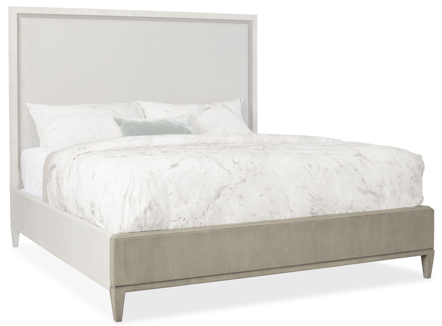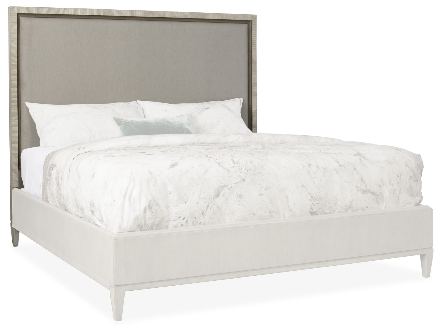 Create a serene refuge in your bedroom with the Elixir King Upholstered Bed that exudes a feeling of comfort and simplicity. The headboard is upholstered in a soft, neutral texture, with the border, footboard and rails finished in a gray-beige finish applied to lightly sand-blasted walnut veneer for an organic and textural look. Bed includes headboard, footboard and rails. Elixir is a casual contemporary collection that, like its name implies, exudes a feeling of comfort, simplicity and well-being. While Elixir has crisp, clean lines, character and visual interest are also achieved through the use of texture. Textural interest comes from the use of lightly sand-blasted walnut veneer, light texture applied to the metal elements along with a hand-carved texture added to the surface of select pieces such as the oval mirror and the round dining table. The buffet offers a beautiful carved starburst pattern on the doors.