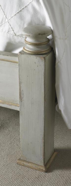 NOTE: AVAILABLE ONLY AS SHOWNBed slats includedWorn light grey paint finish Poplar solidsOff-white linen upholstery with decorative fabric tape and spaced Antique brass nail head trimLow footpost conversion hardware included.