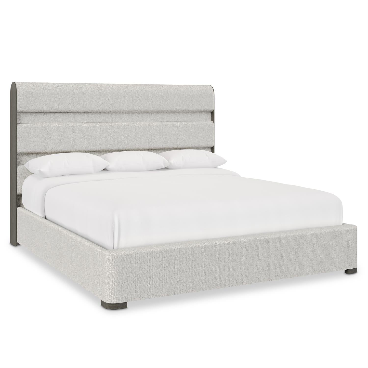 Deep channels and wood details make an elegant mark on this panel bed. Headboard has alternating upholstered and flat fabric panels in fabric B104 and wood ends and feet in Porcini finish