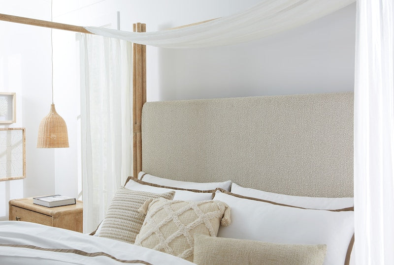 Create a personal oasis inspired by tropical getaways with the Retreat Pole Rattan Upholstered Bed with Canopy. The dramatic bundled pole-designed motif with rope accents creates a laid-back luxury, complemented by the side rails crafted of Oak Veneers and finished in the sand-colored Dune finish, transparent by design to reveal the unique character of the wood veneer. The Neo Cream fabric on the upholstered headboard adds inviting softness and comfort. Includes headboard, footboard and rails. Retreat is crafted with flat cut cathedral oak veneers and is characterized by two distinct finishes. Each finish is transparent by design to showcase the unique grain patterns of the veneer. Dune is light as sand and smooth as a shore after a receding tide. The second finish, Black Sand was inspired by the black silk sands found on the shorelines of exotic beaches of Maui and Tahiti. Inspired by serene, tropical resort destinations that offer an escape from the pressures of modern life, Retreat is designed to help consumers replicate these peaceful and tranquil environments within their home. The collection can be curated in two distinct personalities: Island Oasis and Modern Zen. Island Oasis intermingles both finishes, creating a tropical retreat-inspired vibe accentuated with organic details such as rope, cane, travertine and woven accents. Highlights include a dramatic pole-cane inspired poster bed, island influenced dining pieces and several upholstered accent pieces using printed and woven textiles and soft sage-toned leather. A few pops of accent finishes called Seagrass and Lagoon can be found on select pieces, enhancing the tropical mood of the collection. Modern Zen delivers a tranquil personality with a contemporary twist that showcases the Dune finish, which is enhanced with accent items in Black Sand. Several pieces incorporate woven cane, dramatic split bamboo-inspired accents as well as Travertine stone. Highlights include a woven cane panel bed with clean modern lines and a variety of case pieces featuring geometric patterns and spa-inspired accents. Upholstered stationary and accent seating – available in sage and caramel tone leathers – complete the Zen narrative. Adding the finishing touch, the collection’s hardware is custom designed to match each personality. Look for reed-inspired designs in Island Oasis and gently textured designs in Modern Zen. Both hardware options are featured in a soft pewter plated finish.