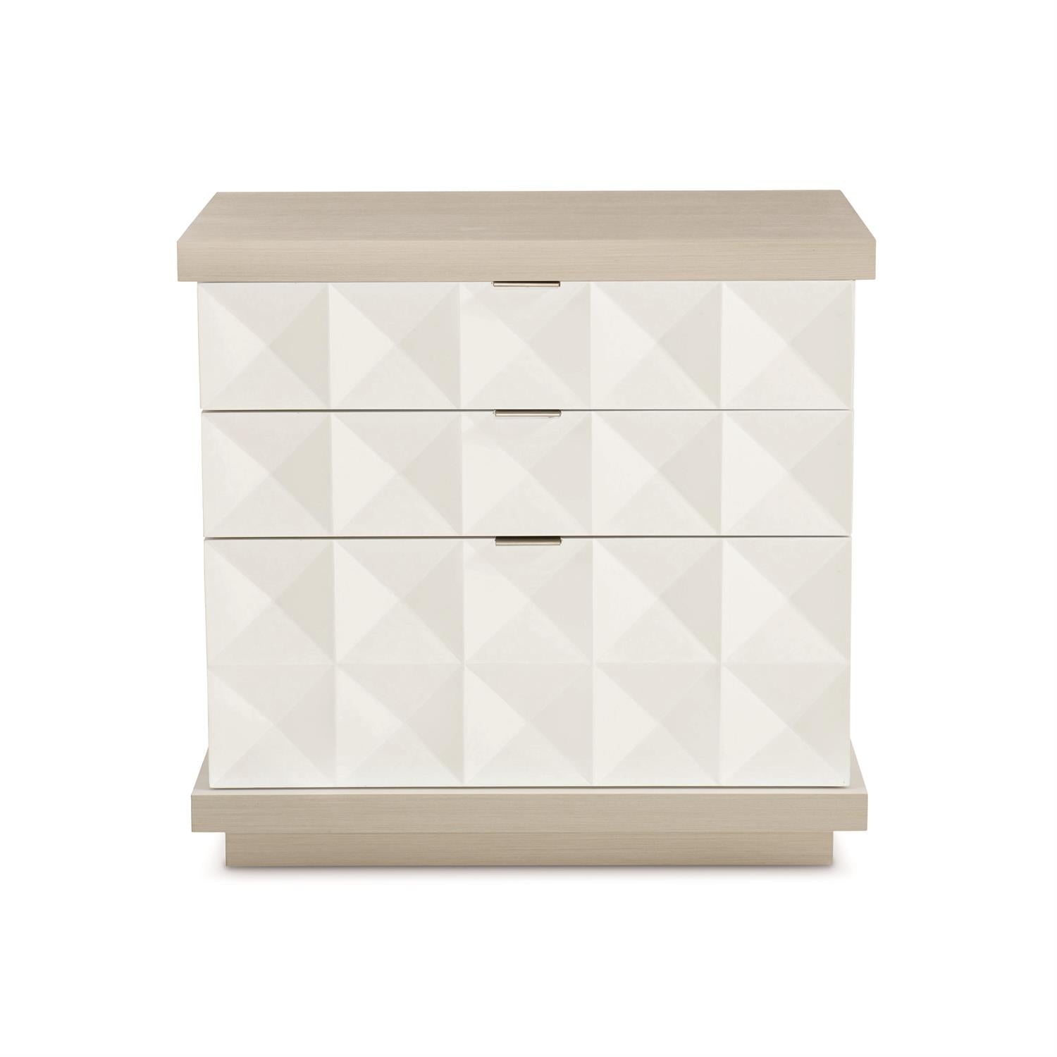 Using unique materials, distinctive finishes and an appealing 3-D motif, this nightstand creates a memorable modern look. Poplar solids and engineered faux anigre veneers