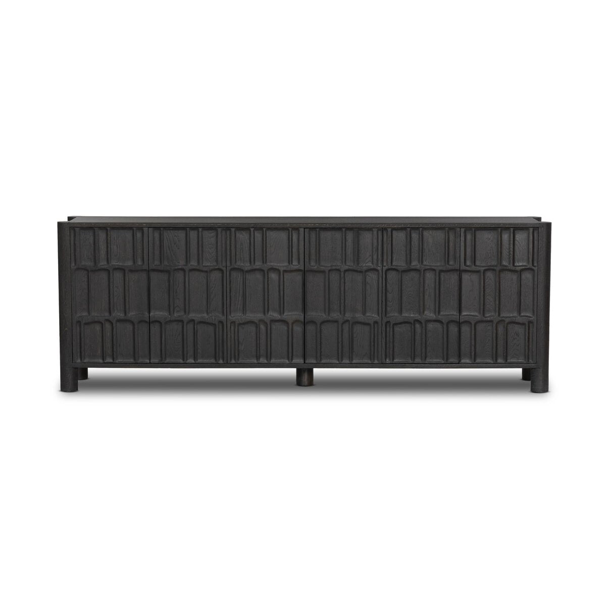 Grain and character variation within a solid oak finish give this sideboard organic visual interest. The carved design and floor-to-top cylinder legs give a primitive look that balances the movement of the wood pattern.