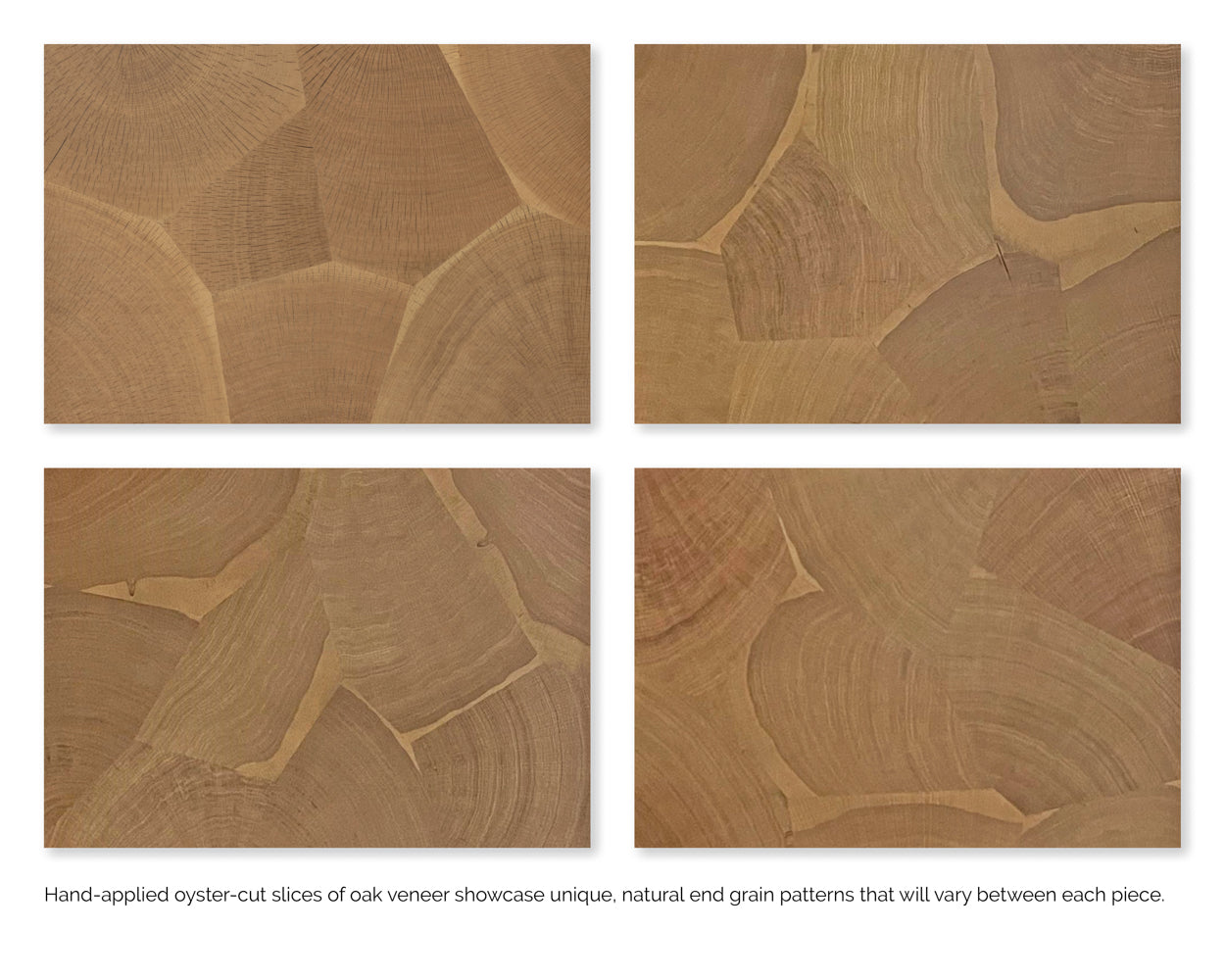 Magnificently crafted from solid oak wood, the Fauna Nightstand is an earthy delight. A stunning mosaic of oyster-cut oak veneer is beautifully pieced together on the drawer front to create a distinct, eye-catching pattern.