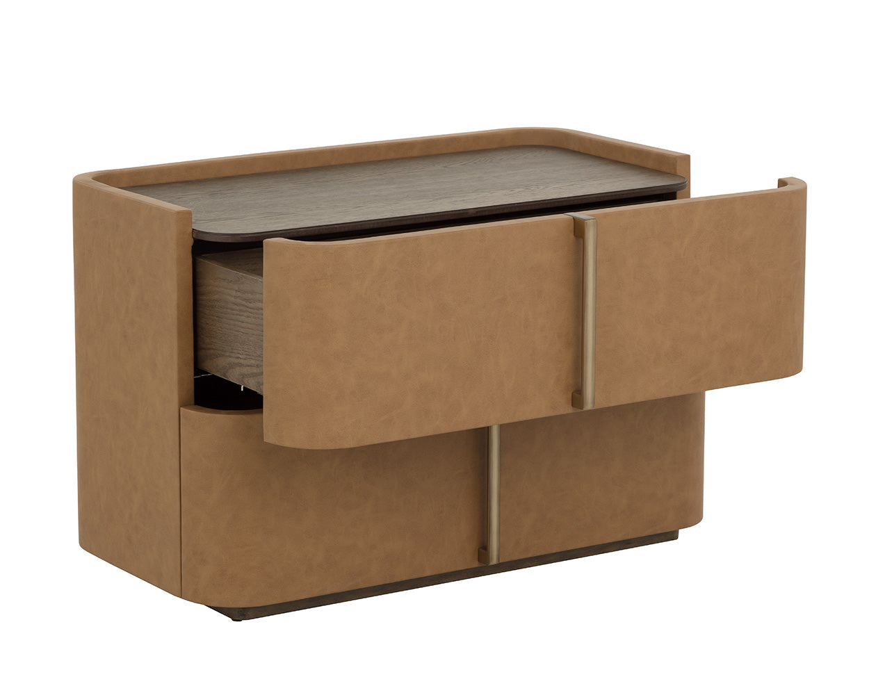 This contemporary large nightstand is defined by its beautiful and gentle curves. Wrapped in cream faux leather with a brown oak veneer tabletop that is sure to impress.