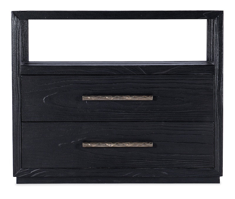 With the aura of a rustic mountain cottage, the Linville Falls Two-Drawer Nightstand has an airy feel with an open area at the top and two self-closing drawers. Crafted of Pine Veneers, the nightstand is finished in Shadow, a charred black finish achieved through Shou Sugi Ban, a Japanese technique that creates a look resembling burnt wood. Textured metal bar pulls in an antique pewter finish add an organic accent. Functional features include a double USB charging port and a cord clip on the back. Capturing the essence of nature’s organic color palette and the aura of a rustic mountain cottage, Hooker Furniture introduces the Linville Falls collection. The whole home collection is designed for younger consumers looking for casual and contemporary furniture. Characterized by its rustic, weathered finish and clean lines paired with organic grain patterns, Linville Falls is constructed with split oak solids and veneers and has an overall organic aesthetic. It is featured in a soft Smoked Gray finish mixed with a Charred Black finish that is achieved through Shou Sugi Ban, a Japanese technique that creates an elegant burnt wood look. Its moderate scaling and fresh silhouettes offer a refreshing juxtaposition mixing old with new.