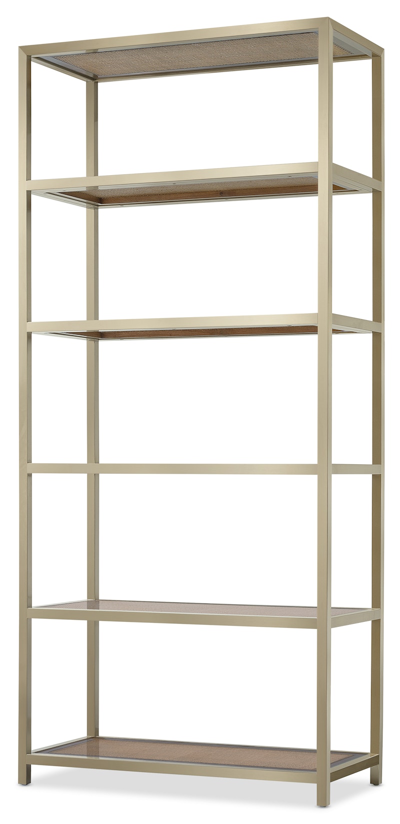 Bring a sophisticated, modern touch to your living room or home office with the Melange Raising Cane Etagere. This transitional piece combines a sleek stainless steel frame with five fixed wood-framed cane shelves, each featuring glass inserts. Perfect for showcasing books, decor, or artwork, the Etagere’s eclectic design combines steel, cane, and glass to offer a globally inspired aesthetic that fits seamlessly into any modern space. Targeting the next generation of furniture buyers, Hooker Furniture unveils the Commerce & Market brand of accent and occasional pieces. Interior designers were front-of-mind when the Hooker Furniture team developed the dynamic palette and flexible applications of pieces within the new brand. The assortment of modern and updated designs presented within the brand include a dynamic variety of materials, styles and color palettes to inject a younger sensibility into the company’s portfolio. Commerce & Market consists of pieces for the living room including a variety of accent tables, credenzas, consoles, chests, cabinets, etageres and bar carts. Globally sourced with design inspiration from around the world, the curated designs feature an eclectic assortment of materials including cast metals, bone inlay, marble, stone, travertine, painted glass, acacia solids, pecan, oak, mango wood, and walnut veneers in a variety of rich finishes.