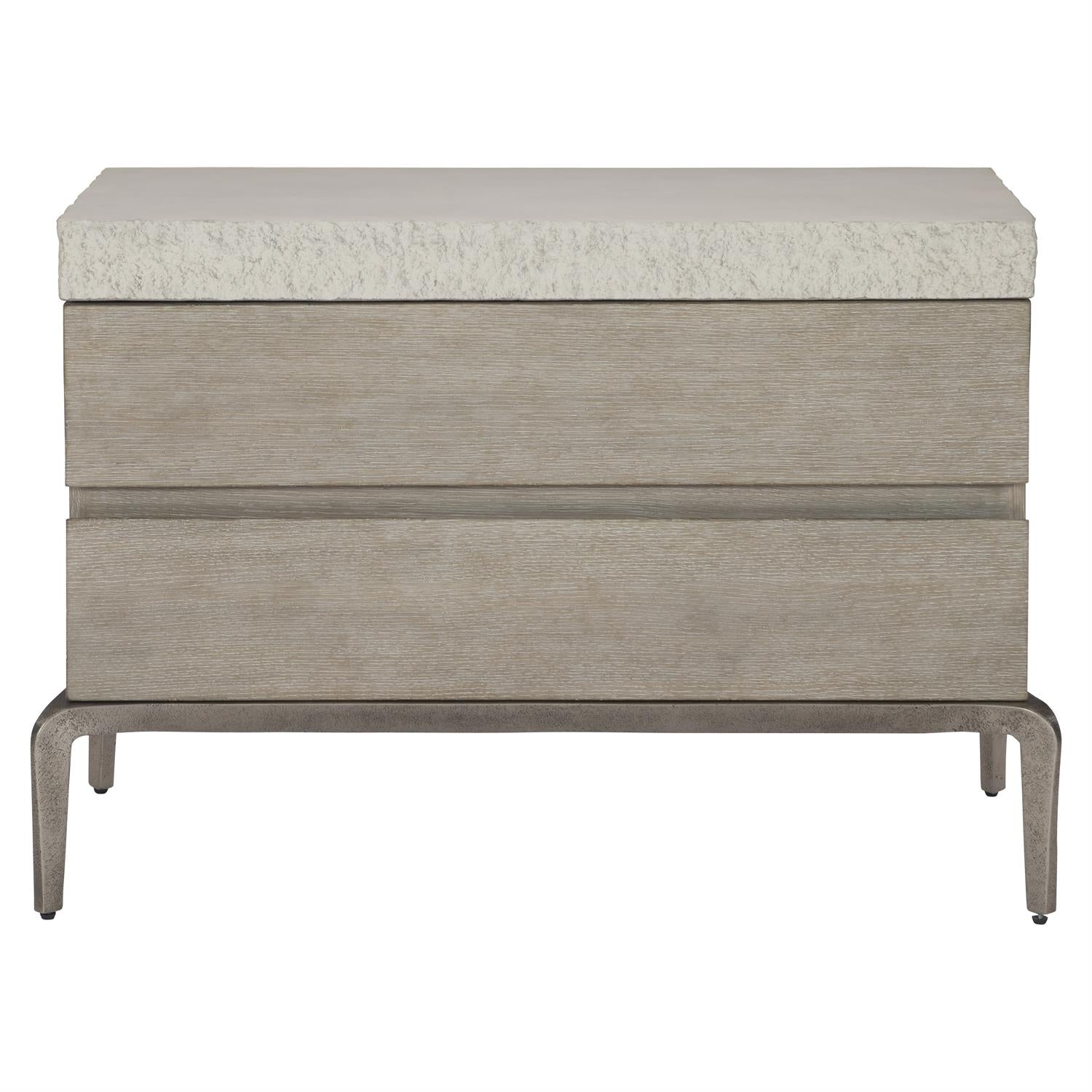 A mix of stunning materials defines a minimalist look in this nightstand. Sand Grey finish cast concrete top with smooth top surface and rough texture on all sides