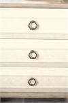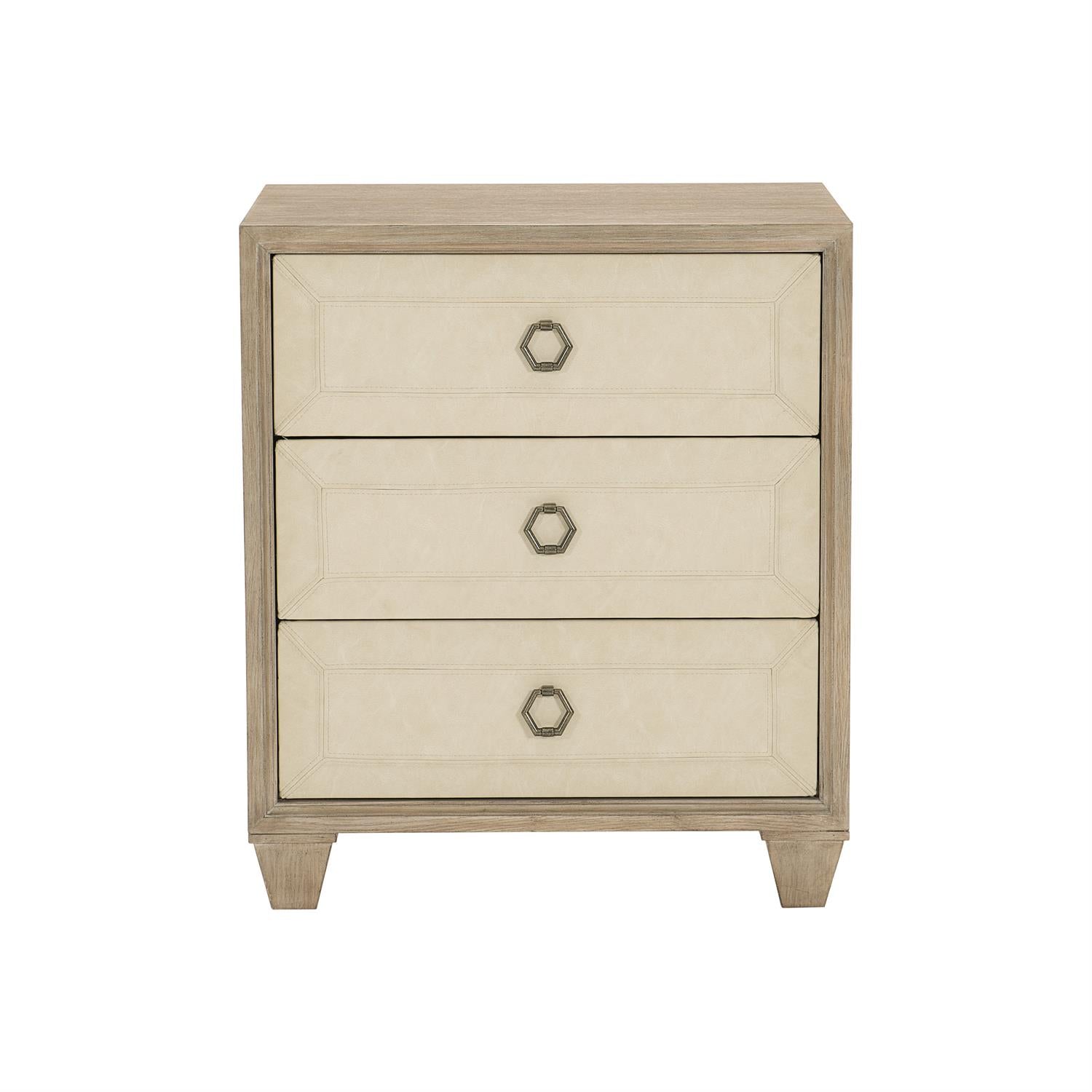 Fabric covers the drawer front on this nightstand, giving it an artistic touch. Three drawers with raised drawer fronts wrapped in performance fabric with double-needle stitching