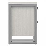 An elevated nightstand design features metal end frames that give it a hint of glamour. Ash solids and engineered veneer in Mist finish with metal drawer pulls and supporting end frames in Polished Nickel finish