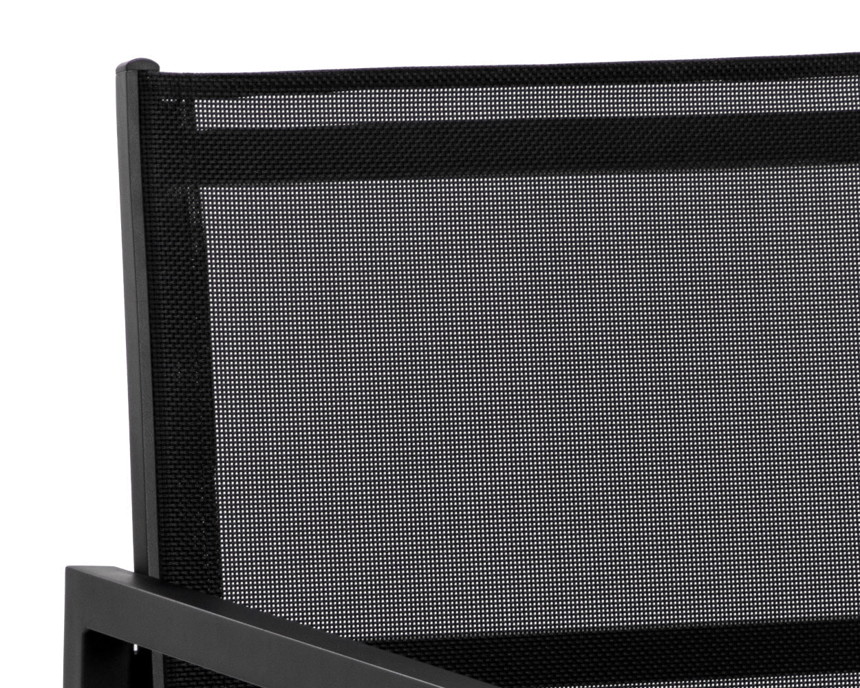 The Merano Dining Armchair is a modern take on classic design. The black powder-coated aluminum frame beautifully complemments the breathable mesh seatback for a comfortable dining experience.