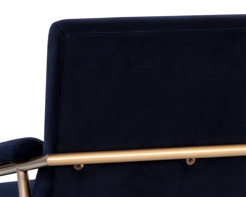 A mid-century lounge chair that features a beautiful design defined by clean lines. Upholstered in abbington navy fabric with a stainless steel frame in an antique brass finish.
