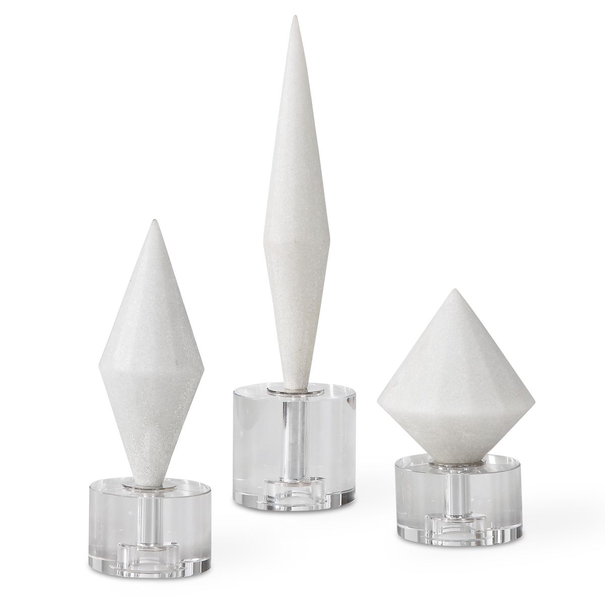 Elegant white diamonds are crafted from ivory man-made stone that accurately replicates the look of Thassos marble atop crystal bases. Sizes: S-5x7x5, M-4x10x4, L-4x14x4