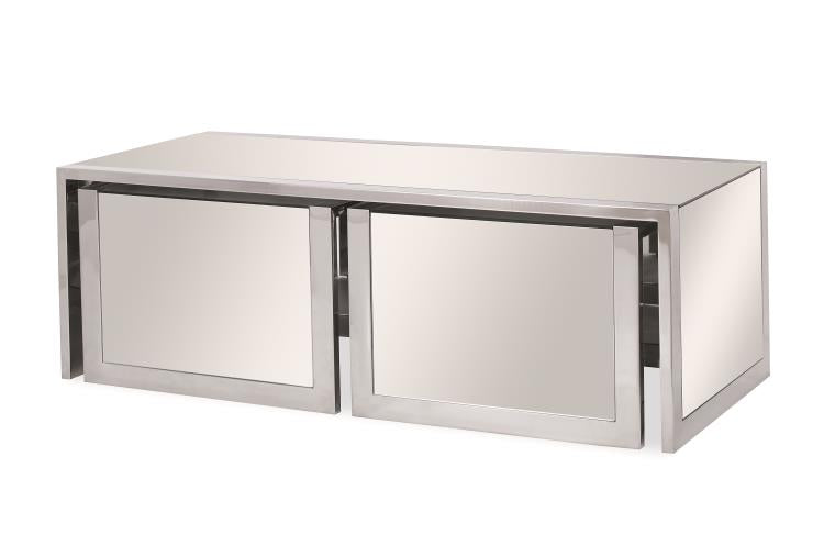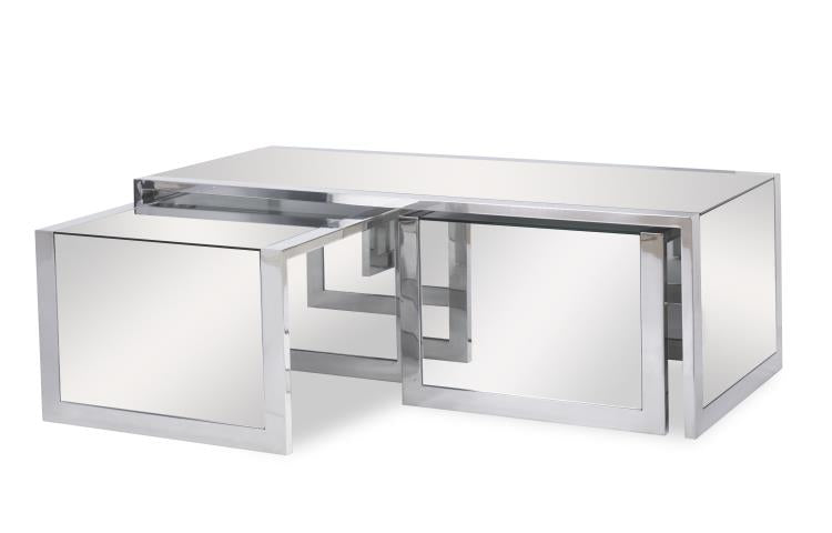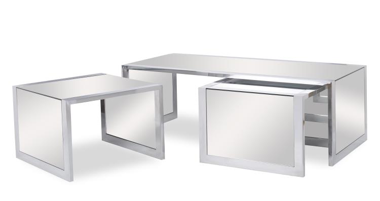 Two smaller tables: W24 x D24 x H16.25Polished nickel metal frame with clear mirrored top and sides