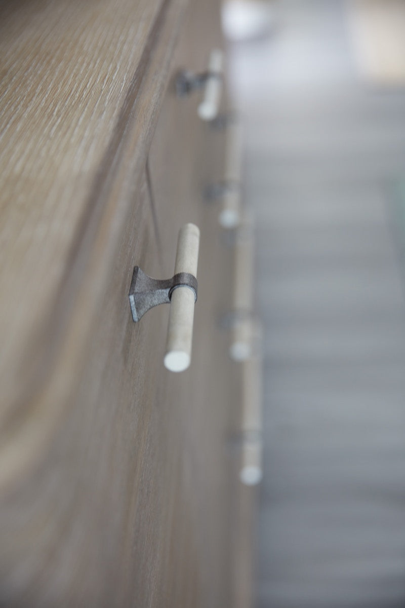 Serene and stylish with simple, clean lines, the Affinity Dresser combines a soft rounded silhouette with a wire-brushed greige and antique white finish to create an inviting transitional look. Pewter and antique white bar pulls add intrigue. Offering 8 drawers, the top drawers have a drop-in felt liner and the right top drawer has a drop-in jewelry tray that sits on a wooden support at the top of the drawer to allow from extra storage underneath. The top drawers have a drop-in felt liner. Soft, rounded forms combine with sand-blasted greige and antique white finishes to create an inviting transitional boutique collection in Affinity. The main finish for the 20-piece collection of bedroom, dining room, occasional, accents and home entertainment is a wire-brushed greige (gray/beige) on quartered white oak. Pewter and antique white hardware and soft linen fabrics add intrigue.