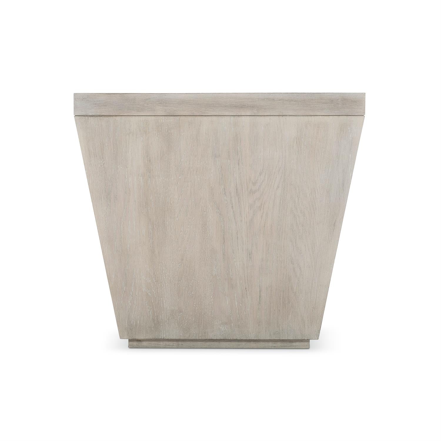 A truly unique piece, this modern end table captures attention with its inverted form and fancy face top. Flat cut white oak veneers