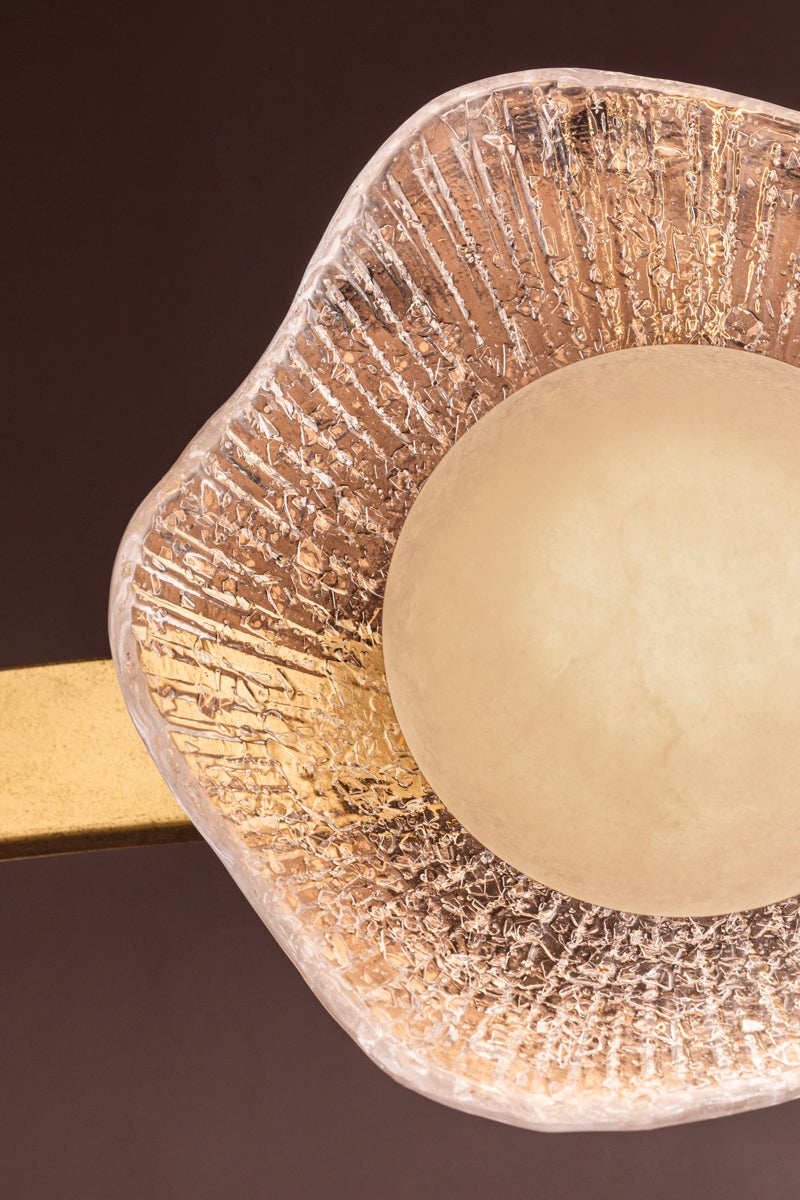 Combining organic and modern elements, Almandine is an elevated take on a traditional ring chandelier. The minimalist frame is accented with floral-shaped shades hand-cut from fluted piastre glass. Finished in Vintage Gold Leaf, the restrained metalwork allows the beauty of the blooms to shine. Almandine is available as a single-tier chandelier with 6 or 9 lights, a double-tier chandelier with 15 lights, and a single-light wall sconce.