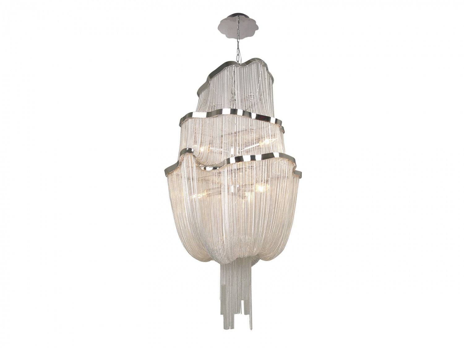 Draped chain design features cascading strands of fine metal chains that create a shimmering, waterfall-like effect, adding texture and movement to the fixture.