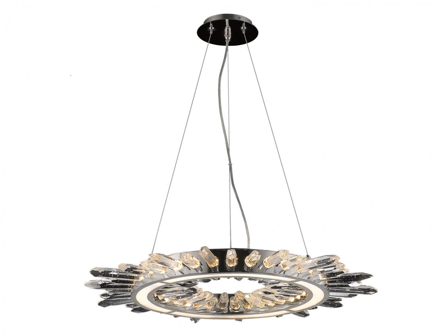 Fixture features a dramatic circular form with radiating crystal-like spikes, resembling a modern sunburst or crown€”offering dynamic symmetry and radiant elegance