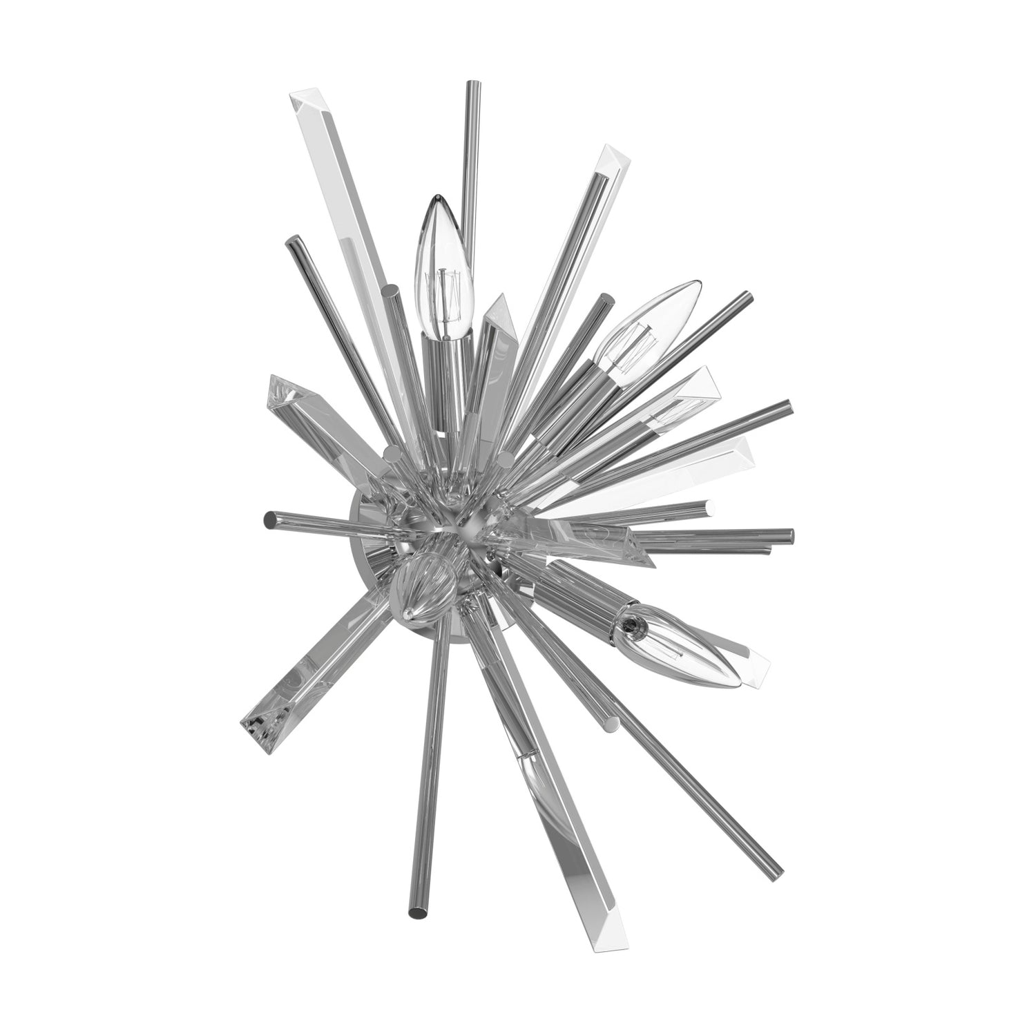 Inspired by the iconic Sputnik design, the Palisades Ave. Collection showcases a dynamic arrangement of varying-sized spokes radiating from a central spear base. This striking fixture is beautifully accented with a mix of glass, metal rods, and glowing bulbs, creating a captivating play of light and form that adds bold sophistication to any space.