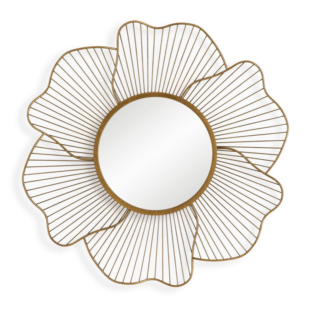 The Blossom Mirror showcases an elegant floral silhouette crafted from curved steel in an antiqued gold leaf finish.