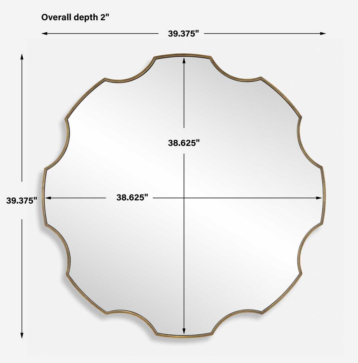 Our gear-shaped mirror boast an iron frame with a channeled side and a richly antiqued golden bronze finish. Its distinctive silhouette encases a floating polished edged mirror, creating a blend of vintage charm with modern allure.