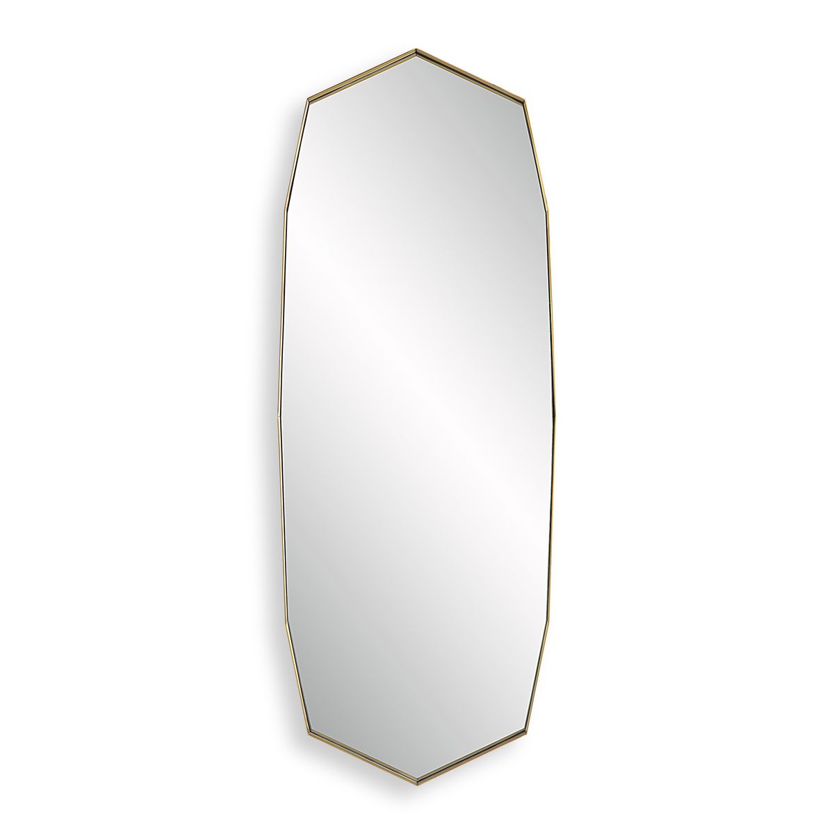 Displaying a contemporary feel, this oversized mirror features a deep, angular metal band frame finished in plated antique brass. May be hung horizontal or vertical.