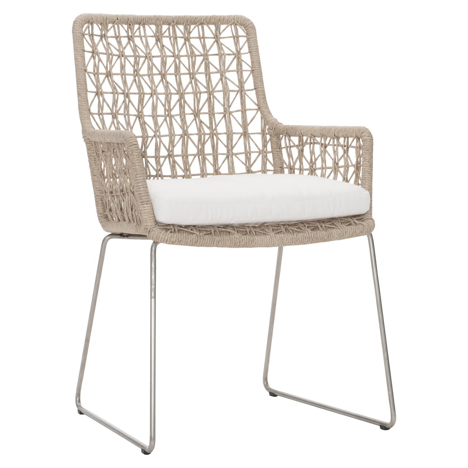A distinctive open weave creates a stunning design on this outdoor dining chair. Arm chair frame of tubular 304 Stainless steel with frame wrapped in twisted All-Weather Wicker in Hazelnut finish.