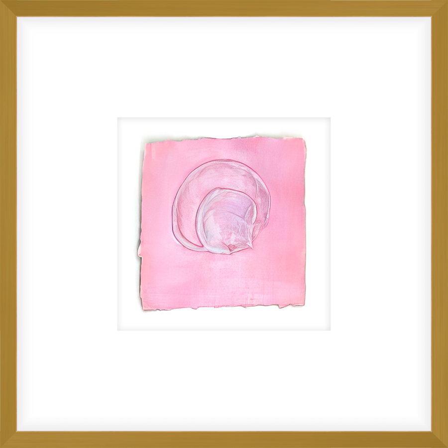 This captivating artwork showcases an abstract, swirling form rendered in delicate shades on a textured, pink background. The piece evokes a sense of fluidity and movement, with soft lines and subtle color variations creating a serene and intriguing composition.
