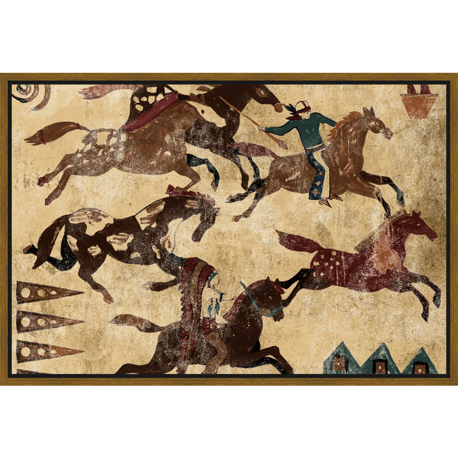 This striking artwork captures a dynamic scene of Native American riders on horseback, depicted in a style reminiscent of ancient cave paintings. The figures are rendered in earthy tones with simple, bold lines, conveying movement and energy. The composition presents a sense of historical storytelling and cultural richness, perfect for anyone who appreciates art inspired by Native American heritage.