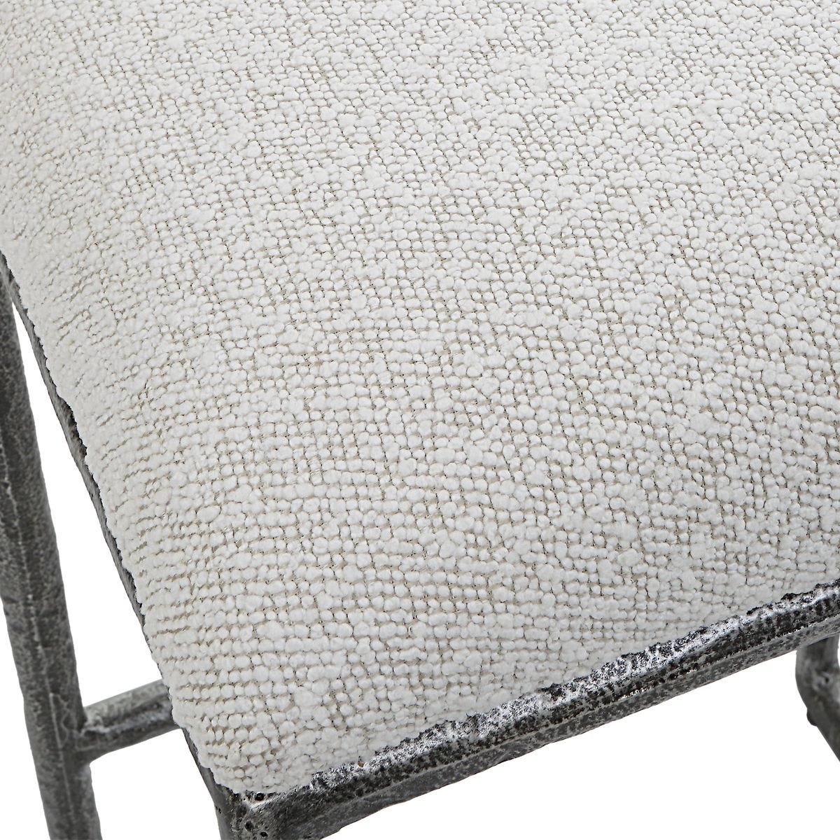 With clean contemporary lines, this open frame design features a textured cast iron base in a natural distressed charcoal finish. Paired with a tight upholstered seat in a casual ivory and light gray boucle fabric.