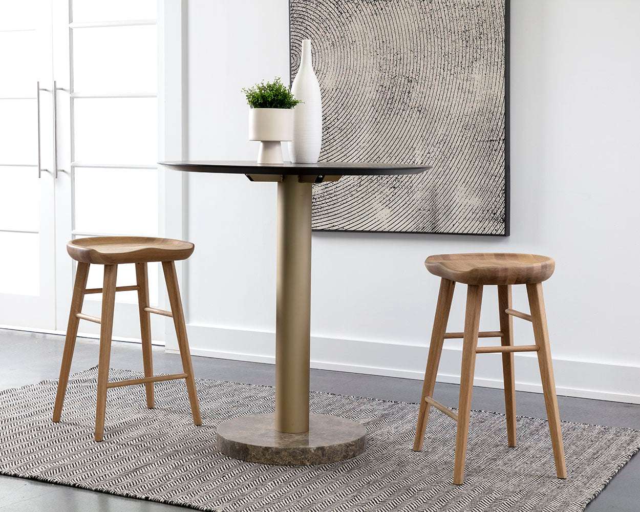 An impressive counter stool crafted from solid walnut wood. The sculpted seat and traditional design will complement transitional, contemporary and modern spaces of any size. As wood is an organic, porous material, these pieces will contain natural variation of texture and may also exhibit fine indentations and cracks. Wood pieces will also display a disparity of colour and grain, and visible knots and burls that add to the character of each piece.