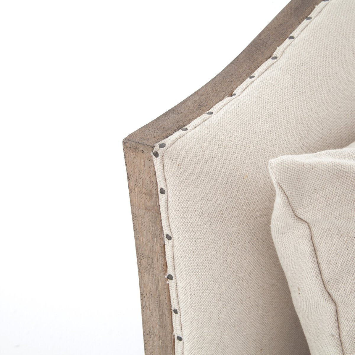 Play up a sense of French chic with a chaise featured and styled to look relaxed. Natural linen, spit tack and iron fleur-de-lis detailing.