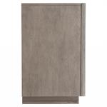Two fixed shelves and two drawers with silverware insert behind paired left and center doors; two adjustable shelves behind right door