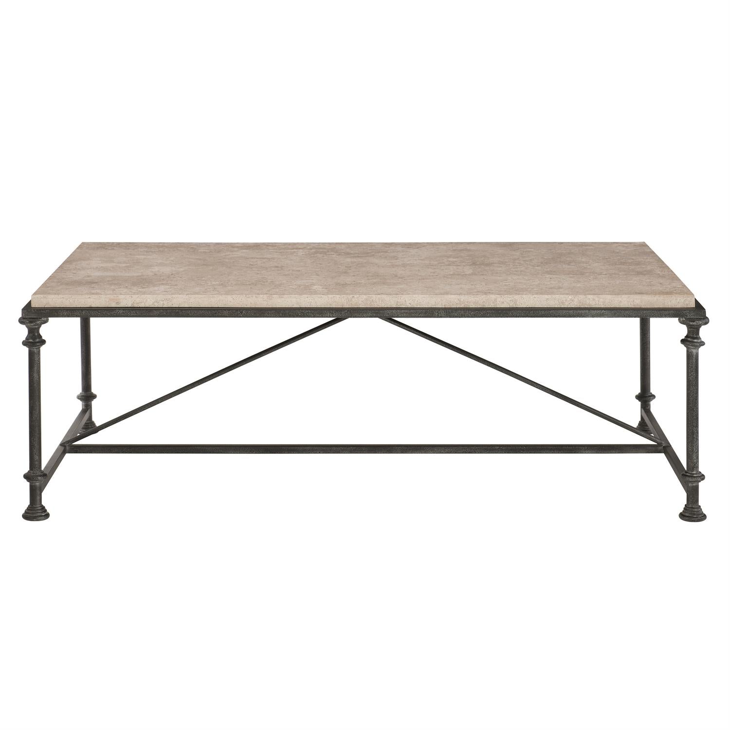 Crafted from honed travertine stone and antiqued steel, this cocktail table delivers architectural style with a luxurious look. Laminated honed Travertine Stone top