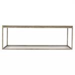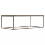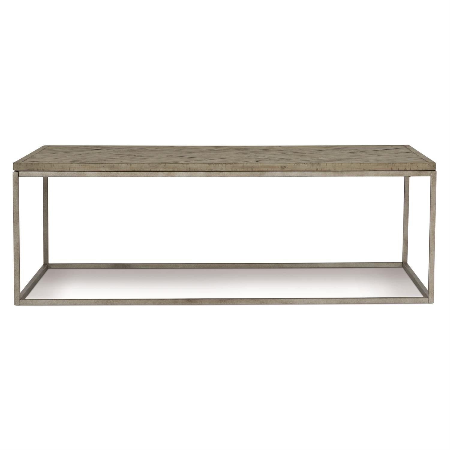 This eclectic cocktail table pairs a tubular steel frame with distressed pine in a herringbone pattern. Solid planked top with overlays in herringbone pattern in Morel finish