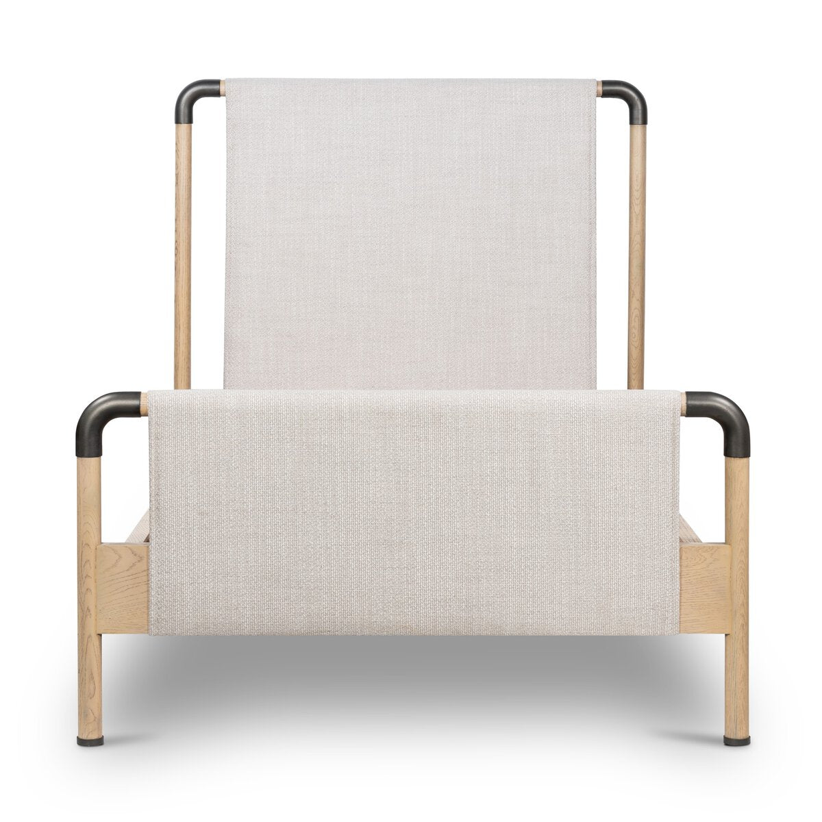 Mixed materials make the bed. Framed by solid oak with rounded iron corners, an upholstered, sling-style headboard brings a light, modern vibe to the bedroom. Performance fabrics are specially created to withstand spills, stains, high traffic and wear, ensuring long-term comfort and unmatched durability.