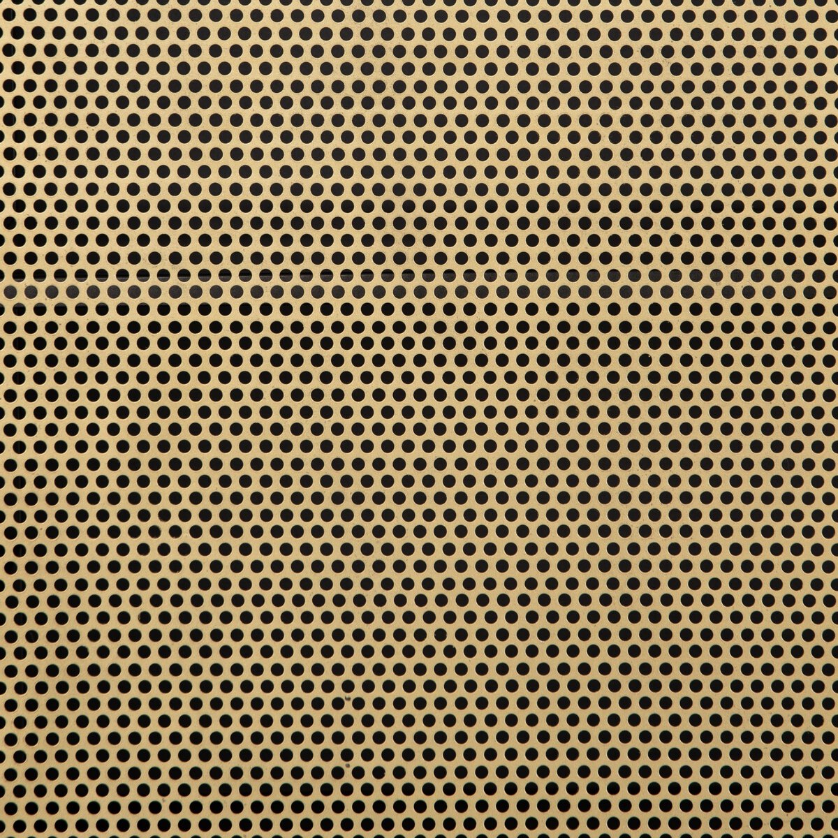 A texture-rich take on streamlined shaping. Mid-century form undergoes a modern refresh via cutting-edge materials and trend-forward finishes. Angular iron framing welcomes front-open cabinetry of perforated brass, as ring-style hardware add a unique finishing touch.