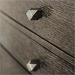 A rustic modern sideboard distinguished by its asymmetrical form, laid-back finish and heavily textured metal hardware. White oak and ash solids and veneers in Cerused Charcoal finish with drawer pulls in Textured Graphite finish