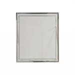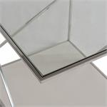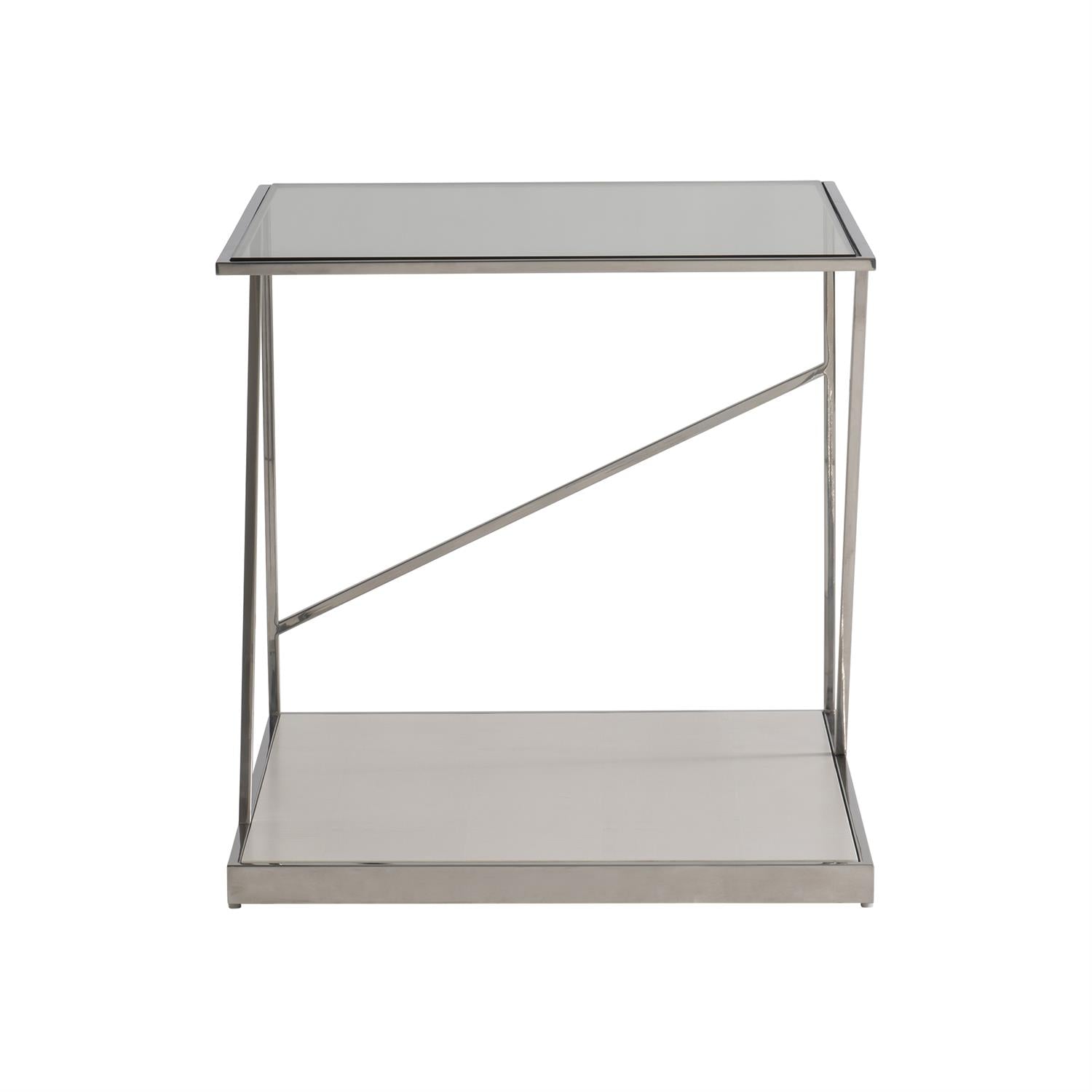 Sharp styling makes a strong point in this mixed media side table. Metal frame in Polished Stainless Steel finish with tempered glass inset top and base with inset figured sycamore veneered shelf in Powder finish