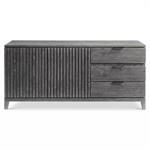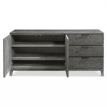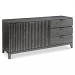 This buffet perfectly balances beauty and function with reeded door fronts and three drawers. Rustic oak in Sutton finish with cast aluminum tab pulls in Dark Graphite finish on doors and drawers