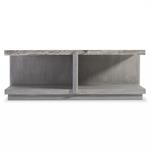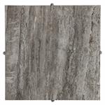A stone top complements the partitioned wood bottom of this modern cocktail table. Oak solids and veneers in Grigio finish with silver travertine stone top