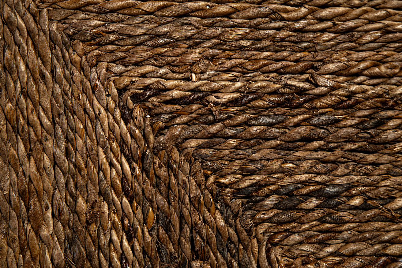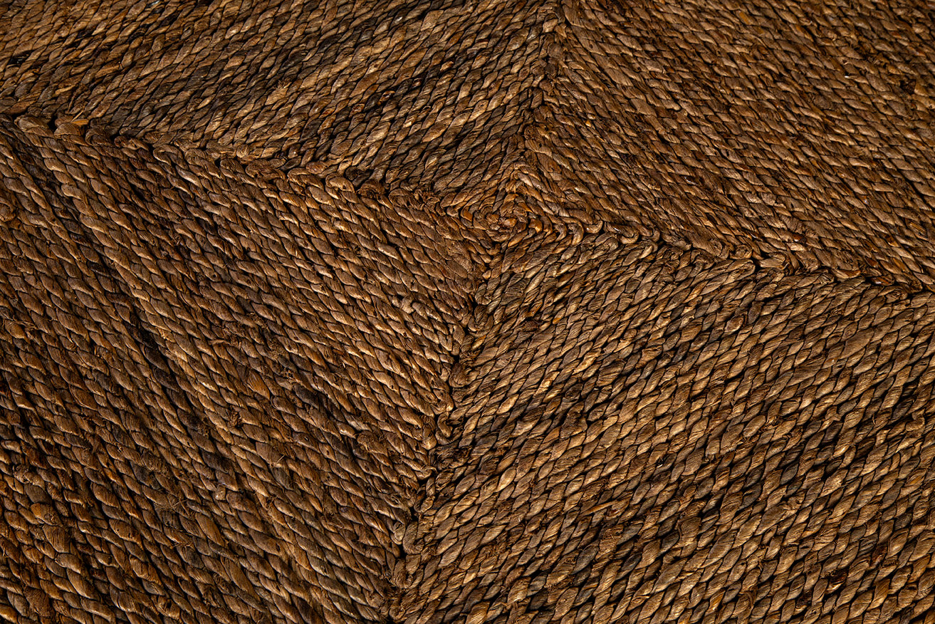 The sustainably-sourced mahogany base provides a sturdy and durable foundation for this intricately wrapped banana leaf table. Showcasing the beauty of eco-friendly materials and artisinal craft manship makes this table a work of art.